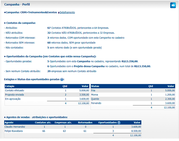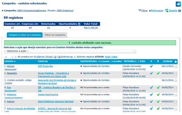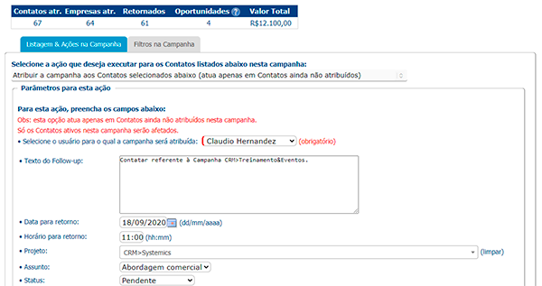 Aqui, um follow-up atribuído a um vendedor específico é gerado para cada Contato selecionado. É possível atribuir Contatos a diversos vendedores na mesma Campanha, assim como é possível realizar filtragens nos Contatos antes de selecioná-los para a atribuição.